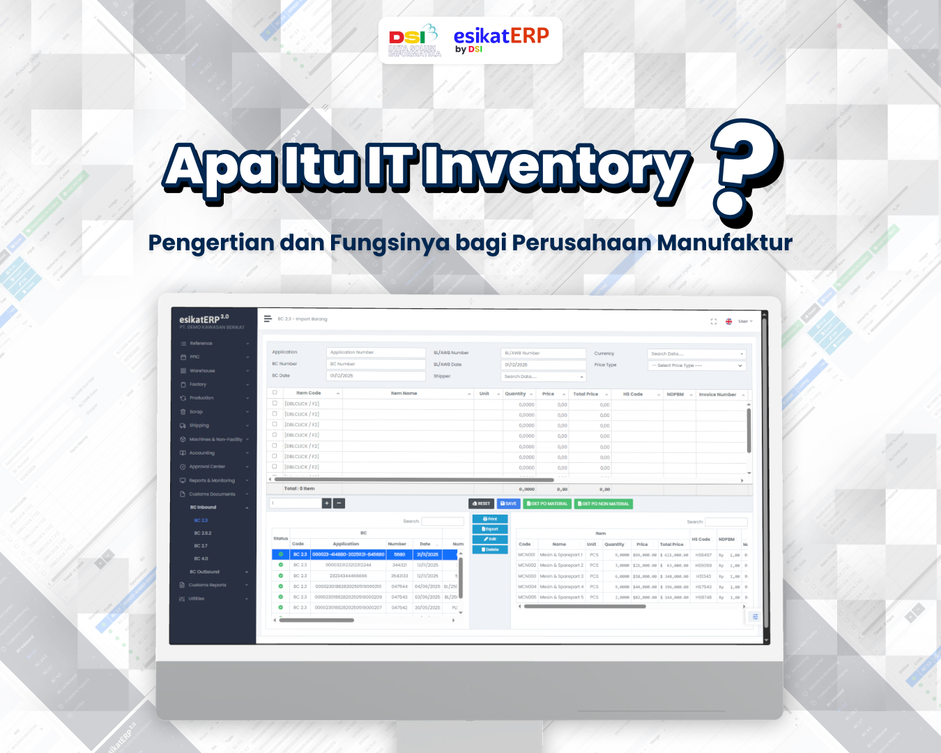 IT Inventory adalah sistem pencatatan digital wajib bagi perusahaan manufaktur berfasilitas KABER, KITE, dan KEK untuk mencatat, melacak, dan melaporkan pergerakan barang secara re...